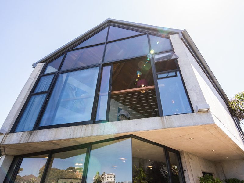 Sunlit penthouse retreat in Upper Central Bird Street cul-de-sac, tranquil garden setting with panoramic Algoa Bay views, enclosed glass balcony, original parquet floors — three beds, two baths, three garages.