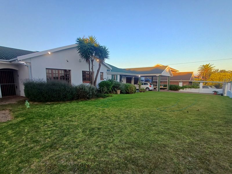 Coastal family living moments from the ocean in Bluewater Bay — generous interiors, covered patio with built-in braai and massive pool, large enclosed garden; four bedrooms, double garage.