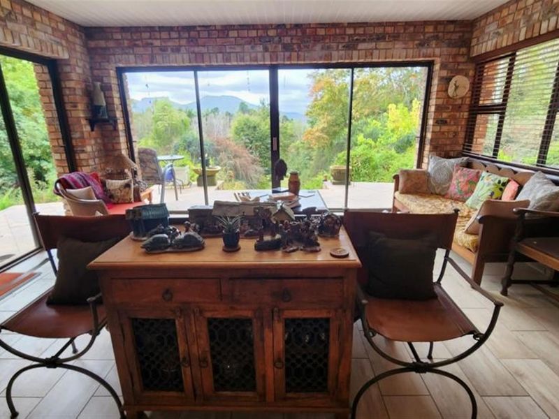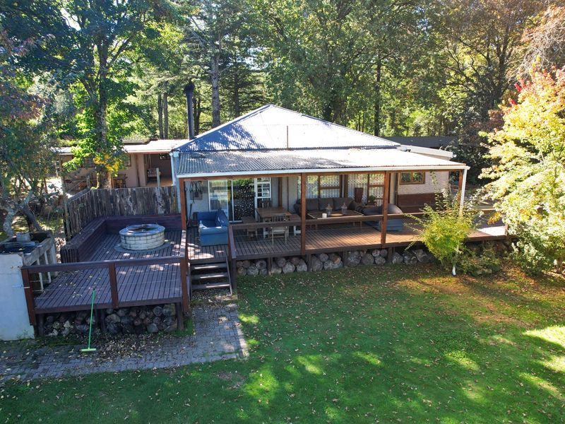 Dine and unwind in Hogsback's Amatole mountain village with panoramic Three Hogsback views, on-site restaurant and income cottages, five bedrooms, four bathrooms, and borehole water.