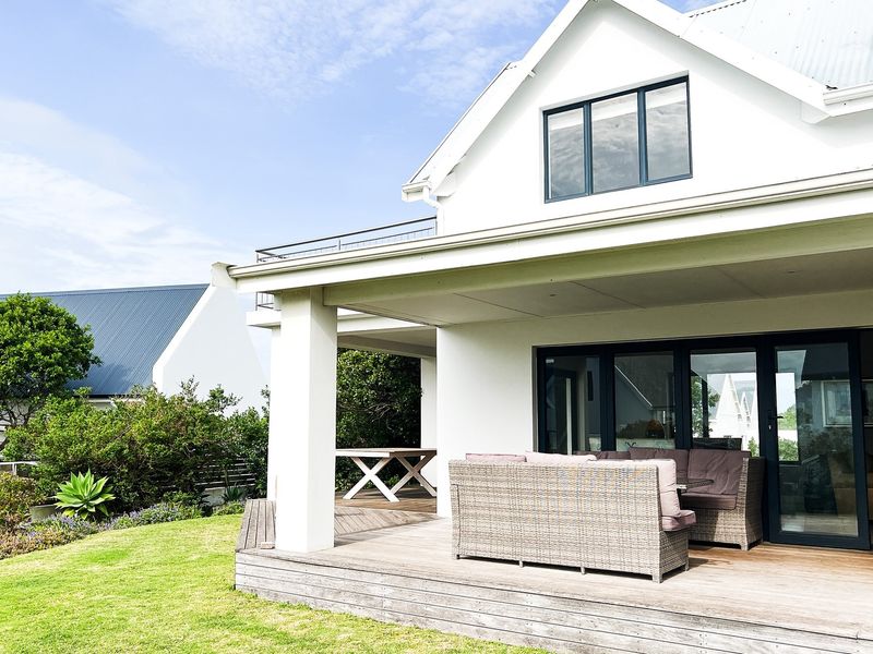 Coastal family living with St Francis Links golf-course charm in St Francis Bay, wrap-around undercover patio with built-in gas braai and garden views, four en-suite bedrooms, study and double garage.