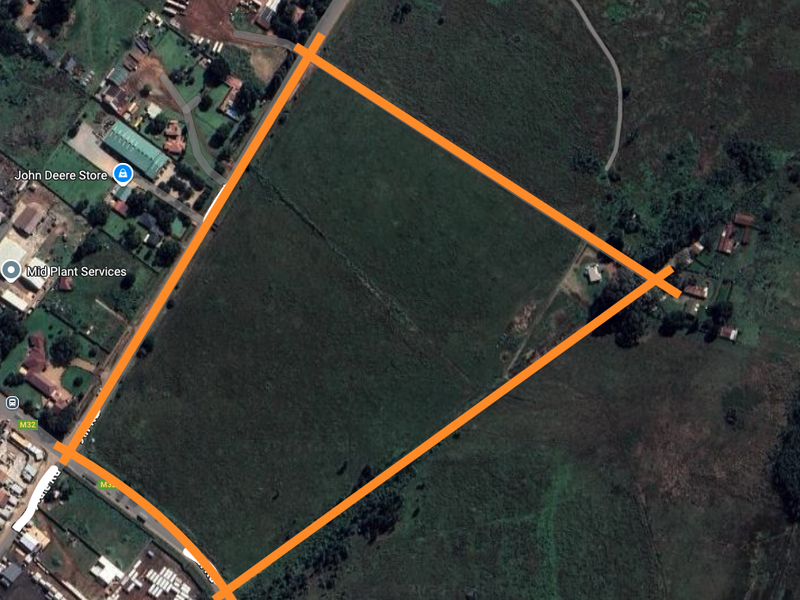 Prime 15-hectare corner site on the main industrial strip, ideal for development — zoned agriculture but earmarked industrial. Includes 160 m² off-grid house with 2 beds, 2 baths, double covered parking.