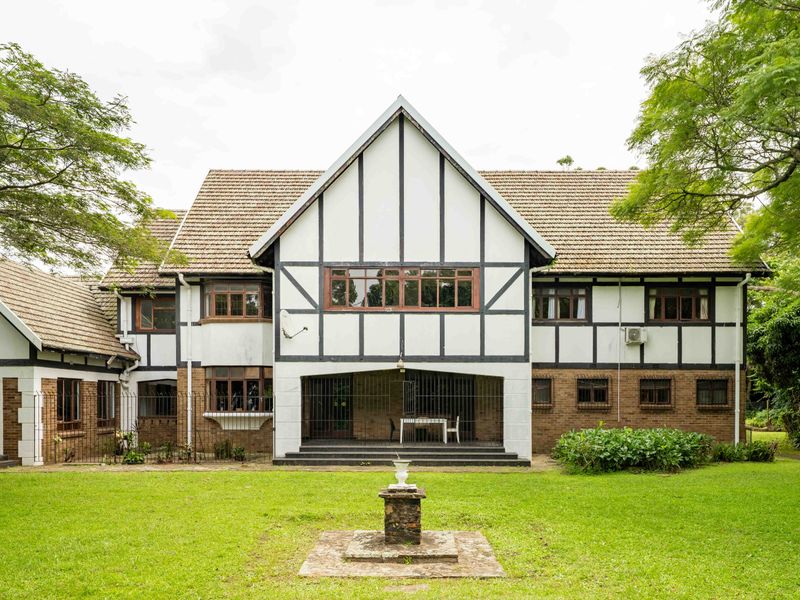 Escape to pastoral KwaZulu‑Natal living on a riverside estate with distant sea views, macadamia and mango orchards, a Tudor manor with grand verandahs and pool—six beds, four baths.