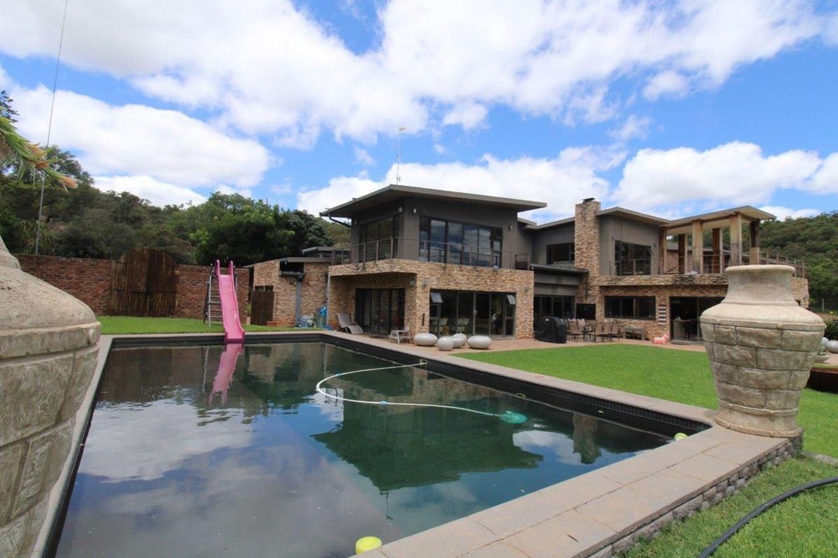 Luxurious 5 bedroom and 5 bathroom house with three lounges, dining room and modern and well equipped kitchen. Two studies and four garages including 1 hanger for the helicopter (helicopter not included) and Heli-Pad. Large swimming pool and well established and manicured garden overlooking the Waterberg mountains.