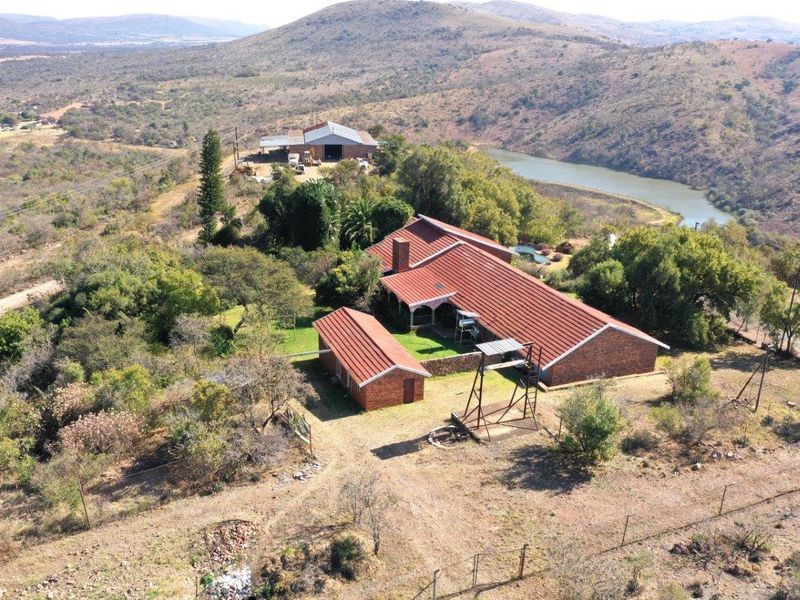 Live self-sufficiently in Limpopo countryside with mountain views and flat arable land; rock-built six-bedroom farmhouse and 48kW solar system powering two 20ha pivots.