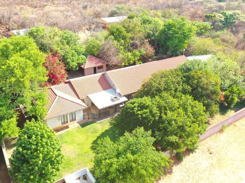 Escape to Waterberg bushveld living along the R101 between Mookgophong and Modimolle, with a large lapa for entertaining, pool, income-generating cottages — four bedrooms, three bathrooms.