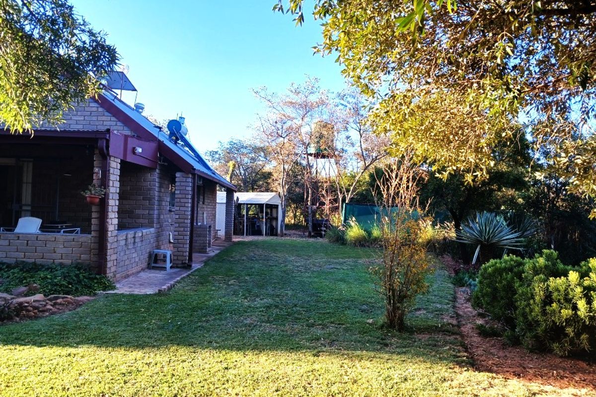 Escape town bustle for peaceful Waterberg living on a 12.8-hectare farm, 4 km from Modimolle, with a mature wild-fig garden, boma braai and three bedrooms.