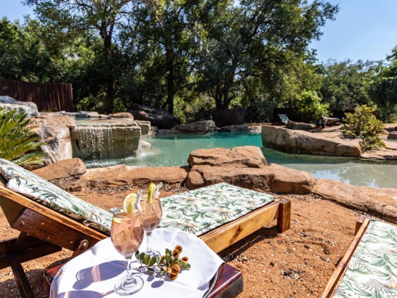 Own an expansive African wilderness retreat near Kruger National Park (15 km) and Leopard Creek, with abundant wildlife, extensive game roads, thatched indoor/outdoor dining, rock pool and boma.