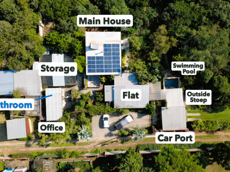 Country living on 15,419 m² with wide open spaces and indoor–outdoor flow, pond and greenhouses, solar-powered borehole; two bedrooms, two bathrooms and single covered parking.