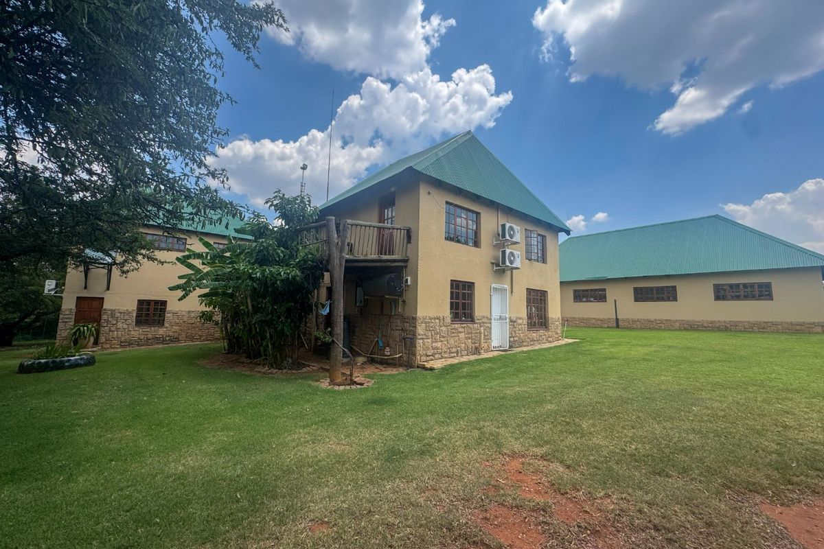 Set on 3.1 hectares in Klerksdorp, this impressive property blends peaceful country living with the practicality of town convenience. The double-storey main residence offers four spacious en-suite bedrooms, each with its own bathroom, delivering privacy, comfort and a high standard of living. High ceilings throughout and striking wooden finishes on the upper level create warmth and a timeless, upmarket feel.