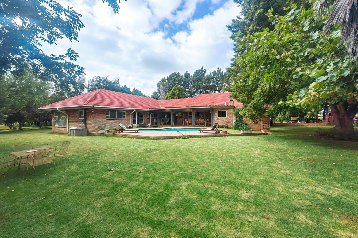 Embrace relaxed country living amid rolling fields and open skies, on 8.7 hectares with irrigation and three boreholes — farmhouse with gourmet kitchen, pool, four bedrooms, two bathrooms and covered parking.