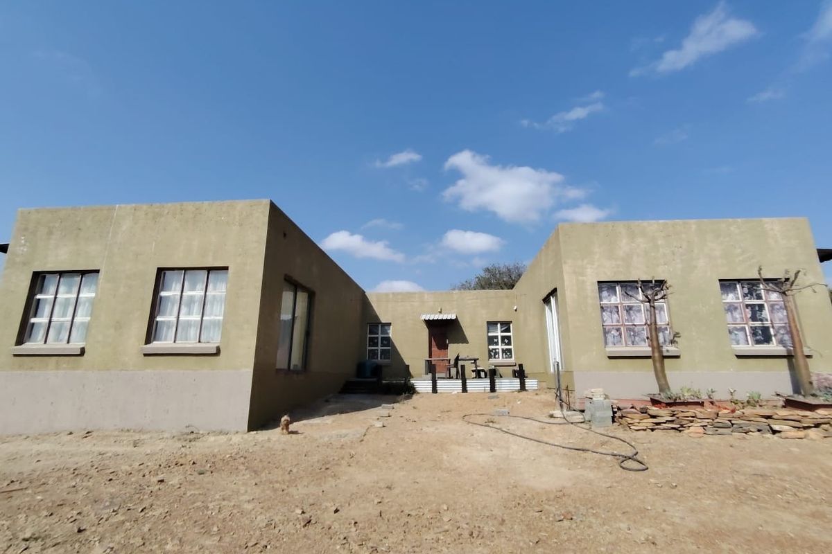 Escape to mountain-top country living near Swartruggens with panoramic dam views, off-grid solar power and guest log cabins — main stone house with three bedrooms and covered parking.