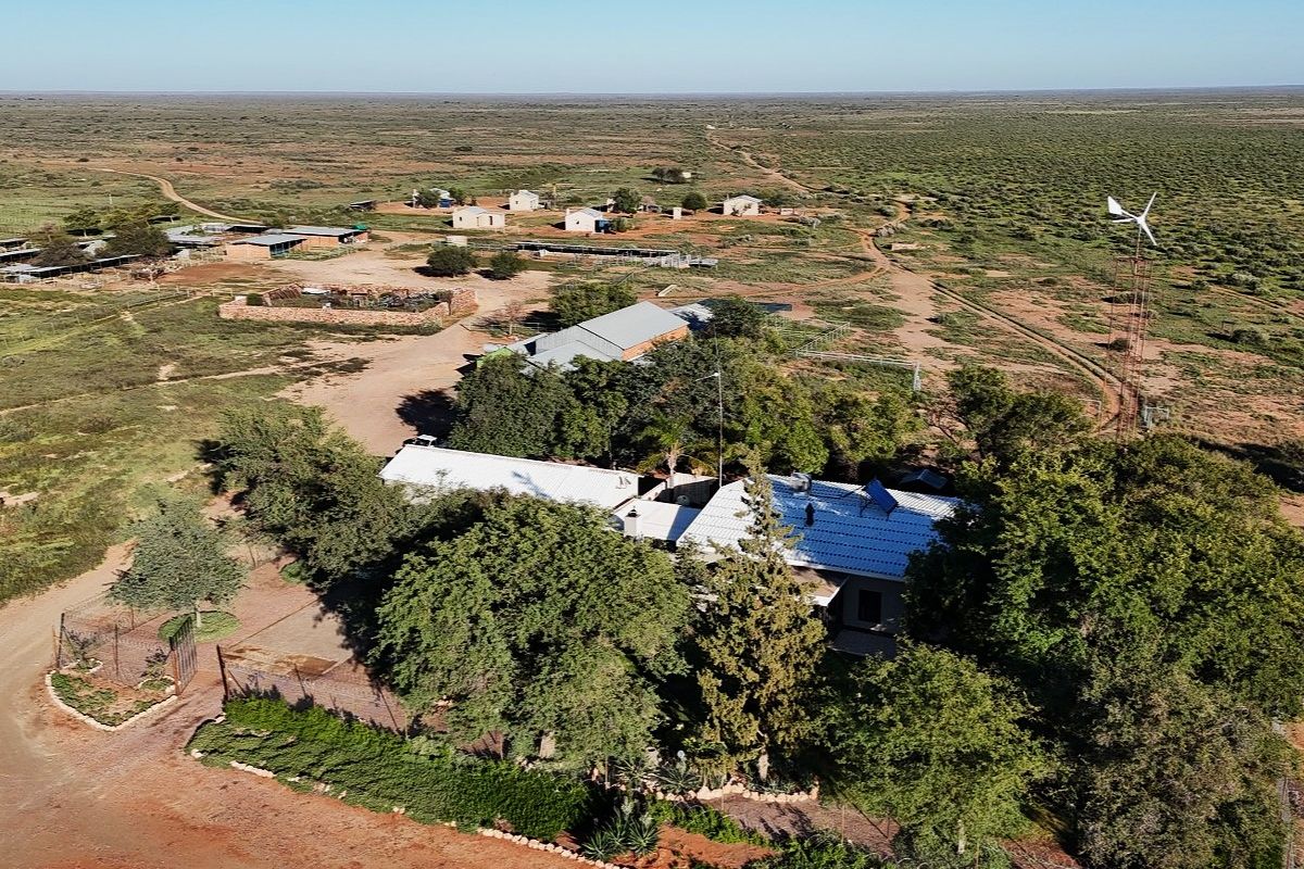 The homestead is powered by a renewable energy system comprising a 6kW inverter, six 540W solar panels, a 1000W Windbull wind turbine, and 18 x 2V batteries housed in a temperature-controlled room. Additional water security is provided through a connection to the Kalahari West pipeline.