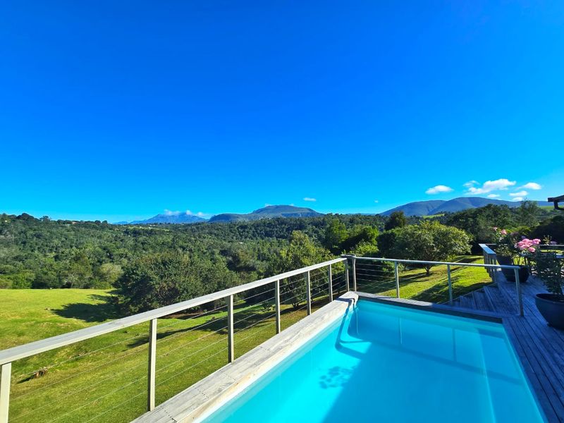 Peaceful country living on 2.8 hectares near the Outeniqua Mountains, with walking trails through manicured gardens and an entertainment room overlooking sweeping mountain views.