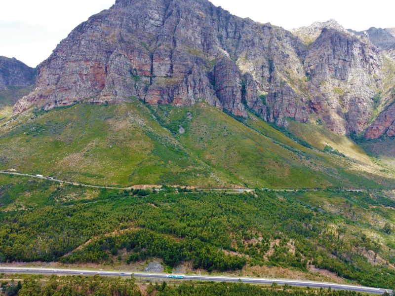 Mountain-edge 12.9ha parcel on Drakenstein slopes overlooking Du Toits Kloof — uninterrupted Paarl and Riebeek Valley views, tarred access, 1500gph borehole; room to build two homes plus cottage.