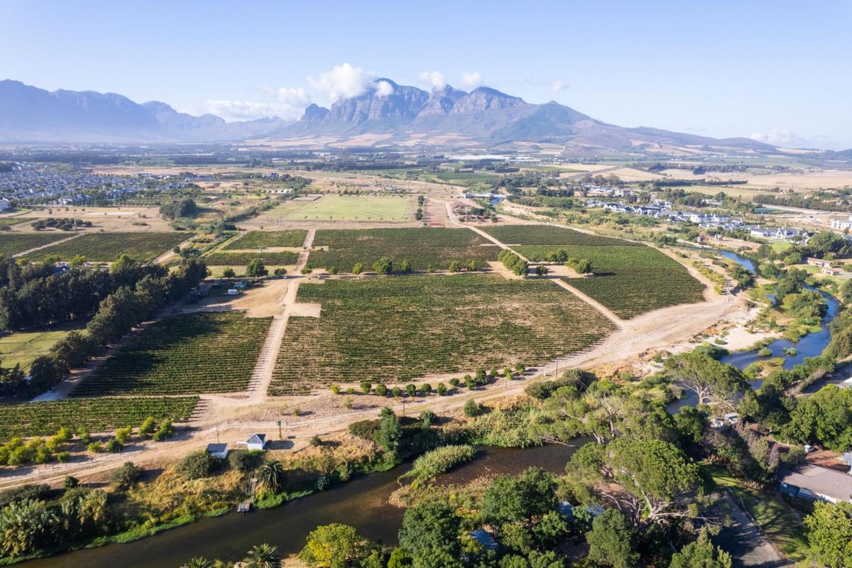 Set against the dramatic amphitheatre of the Simonsberg, Paarl Rock and Franschhoek mountains, this expansive landholding unfolds across approximately 27 hectares of prime Winelands terrain. It is a place where the rhythm of nature sets the pace of life, where vineyards meet open fields, and the gentle presence of the Berg River lends a quiet sense of permanence.