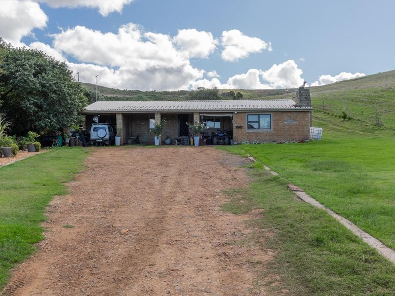 Embrace wide-open Western Cape farm life just 26 km from Riversdale and 13 km from Heidelberg — game-rich terrain with 13 soil dams and arable land, five-bedroom farmhouse, two baths.
