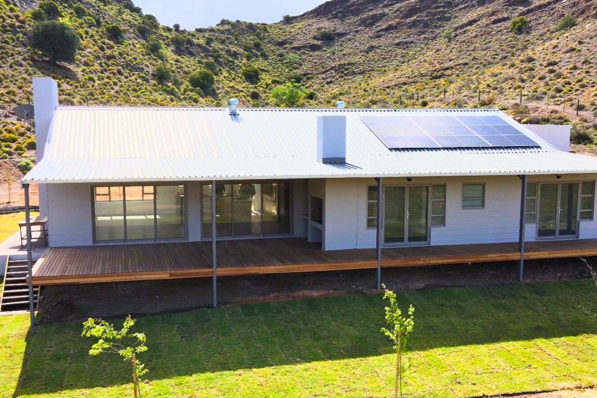 Create an eco-retreat on 239ha of Karoo highlands, 30 minutes from Riversdale, with sweeping Karoo views from an expansive Garapa deck and a modern four-bed, four-bath home.