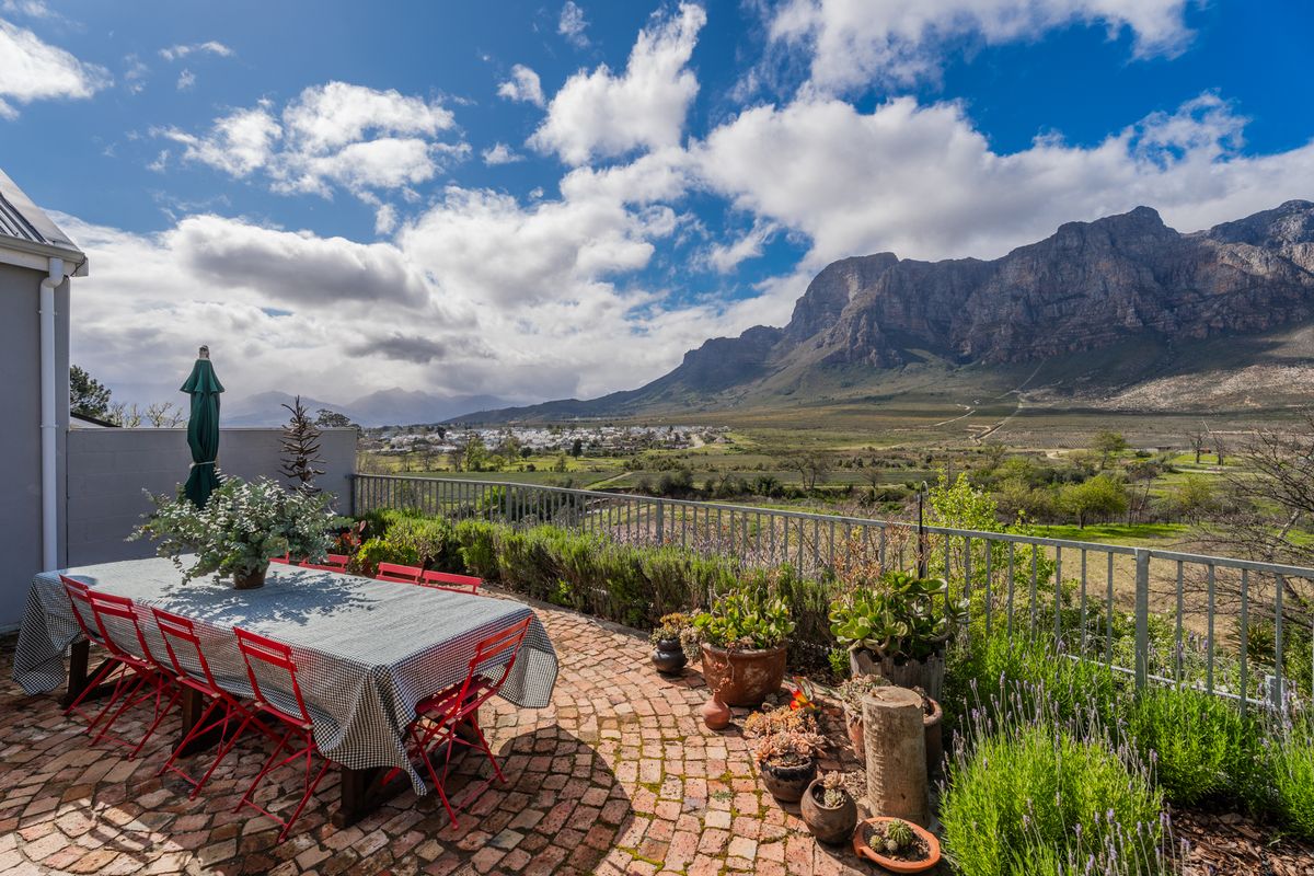 Winelands country living near Stellenbosch in Johannesdal, with panoramic Dwarsrivier Valley views, irrigated established gardens and fruit trees — three homes offering seven bedrooms and five bathrooms.