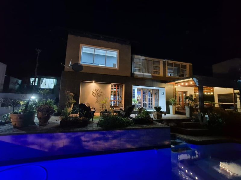 Alfresco entertainers' dream embracing South African lifestyle, with lush garden, pool and under-roof deck with built-in BBQ. Five bedrooms, 3.5 baths and parking for six vehicles.