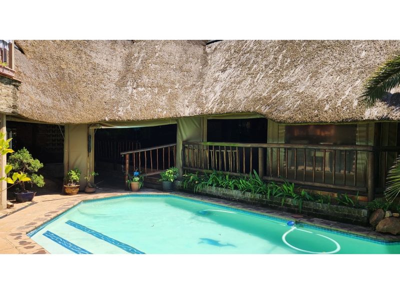 Vaal Dam lifestyle in Deneysville — entertainer's double-storey home with lapa, pizza oven and built-in fish tank, private rock-feature pool garden, four bedrooms and office balcony.