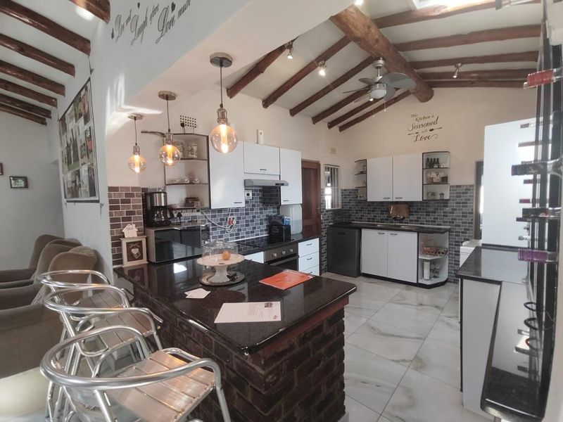 Relaxed family living in peaceful surroundings on a generous 1500 m² stand, with thatched patio and built-in braai, huge study, workshop-equipped triple garage, including three bedrooms and two bathrooms.