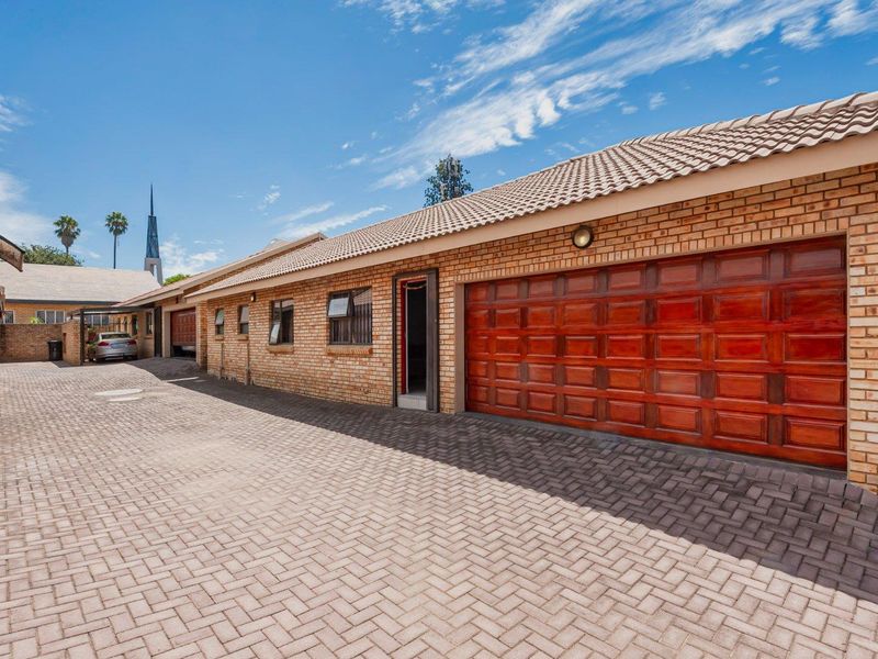 Lock-up-and-go living in a quiet six-unit face-brick complex, with manicured private garden and covered patio — three beds, two baths, double garage, full solar system with battery.