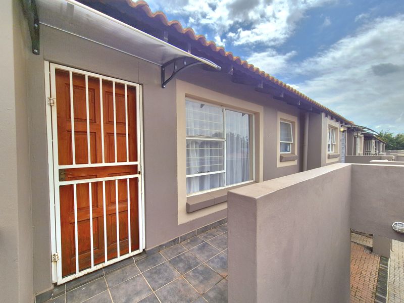 Convenient Van Dyk Park living in secure Malachite Mews, steps from malls and highways — open-plan unit with balcony and built-in braai, two bedrooms, covered parking.