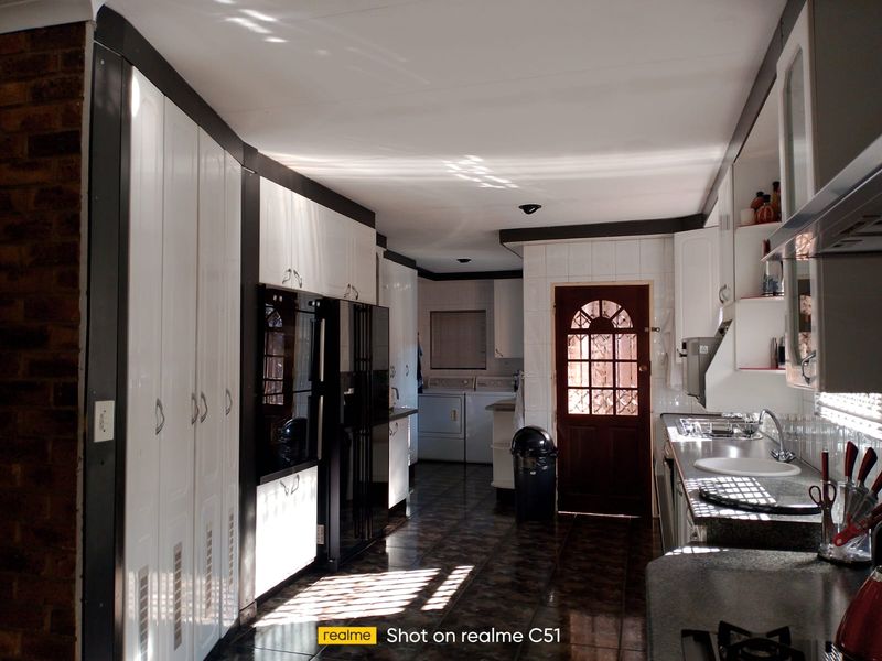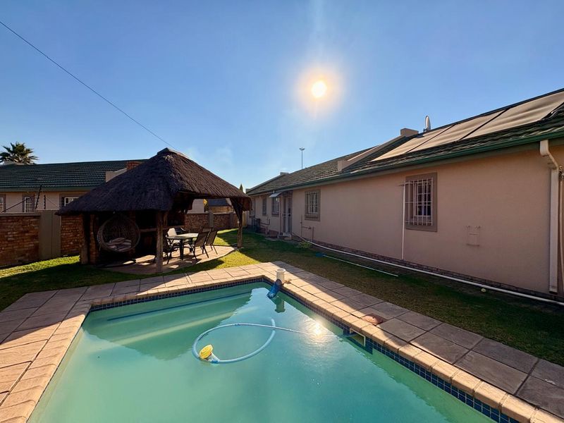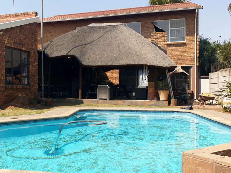 Perfect for entertaining in family-friendly Dalpark Ext 1 — thatch lapa with built-in braai and bar, pool and yard; main home has four bedrooms and two flatlets.