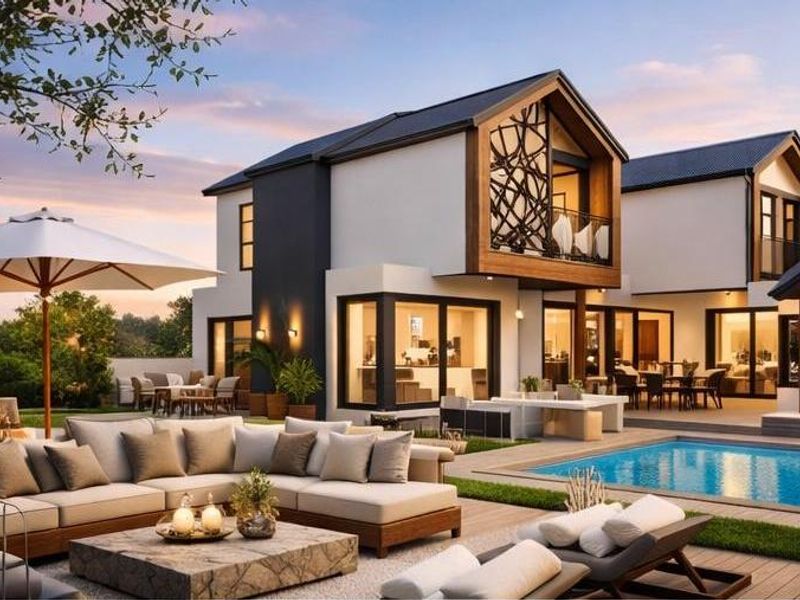 Entertainer's retreat in Fountainbrook Estate, adjacent to Midstream Estates — seamless indoor-outdoor flow to pool and garden with built-in braai and bar. Four beds, three baths, double garage.