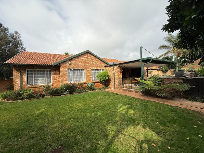 Family-focused living in Highveld Ext 12 with a large landscaped garden and covered entertainment patio featuring a jacuzzi and built-in braai. Three bedrooms, two bathrooms, double garage.
