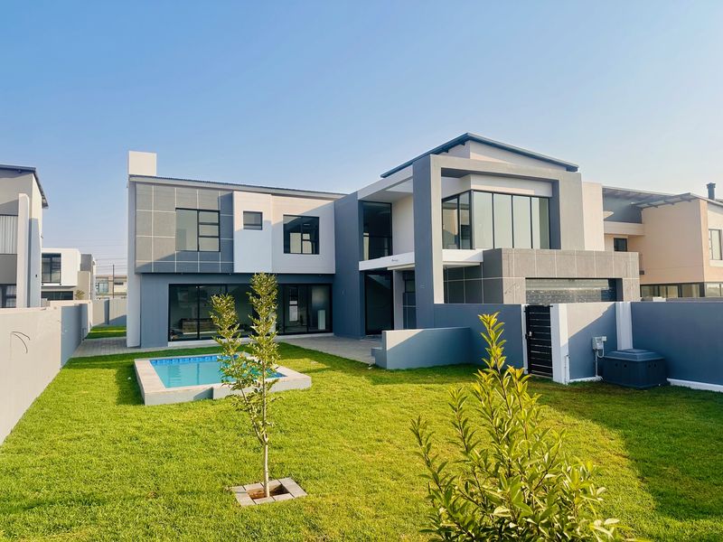 Park-side Midstream Estate family home ideal for entertaining with covered patio, pool and built-in braai; solar-backed energy, private balconies and three garages, four bedrooms, three bathrooms.
