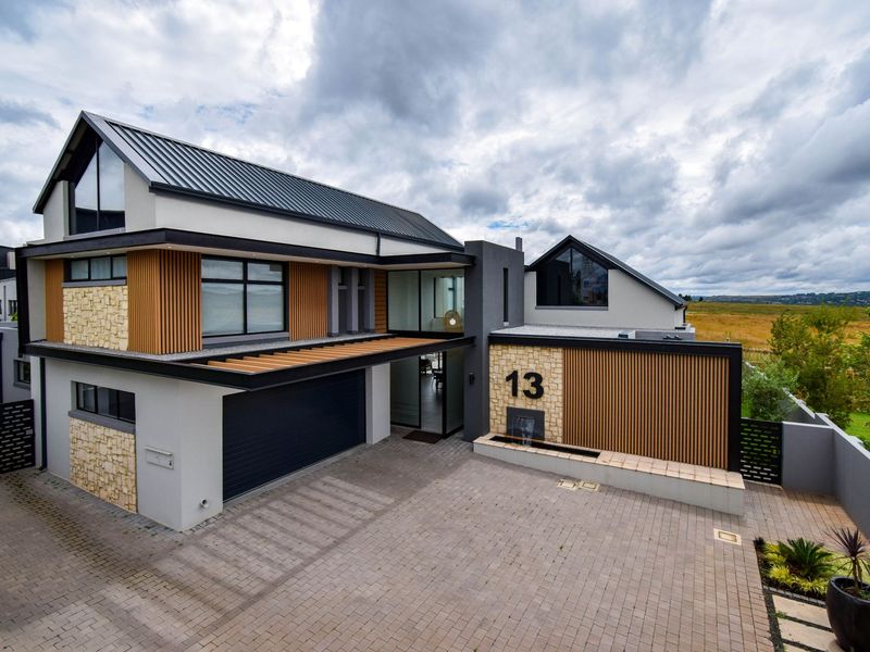 Entertain effortlessly in sought-after Midstream Heights—open-plan living with chef’s island, scullery and staff suite, entertainment room with built-in braai, pool, upstairs pajama lounge; five beds, 6.5 baths, double garages.
