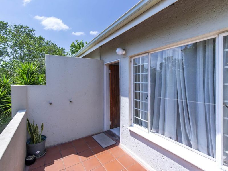 Relax in family-friendly, secure living in boomed Edenglen Extension 18, walking distance to top schools; upstairs apartment with high beamed ceilings, private balcony views, two beds, two baths.
