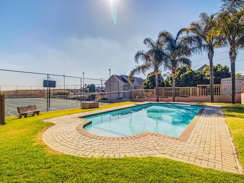 Resort-style complex living close to local shops with two pools, tennis court and communal braai—ideal for social weekends. Open-plan kitchen with breakfast nook, two bedrooms, one bath and carport.