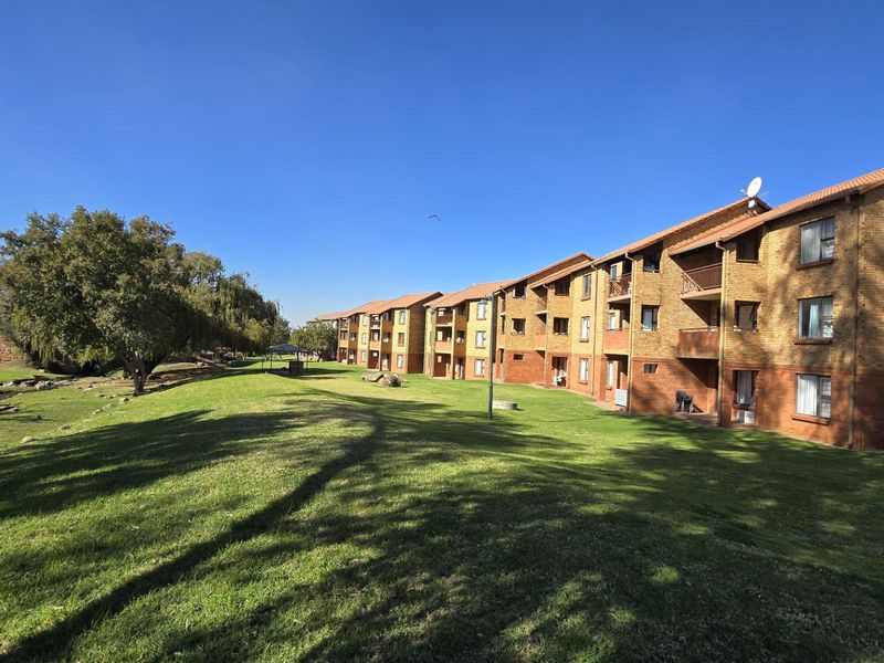 Lock-up-and-go living in Stone Arch Estate, Castleview, Germiston — enjoy balcony views over a manicured park, estate pool and play area; two bedrooms, one bathroom and covered parking.