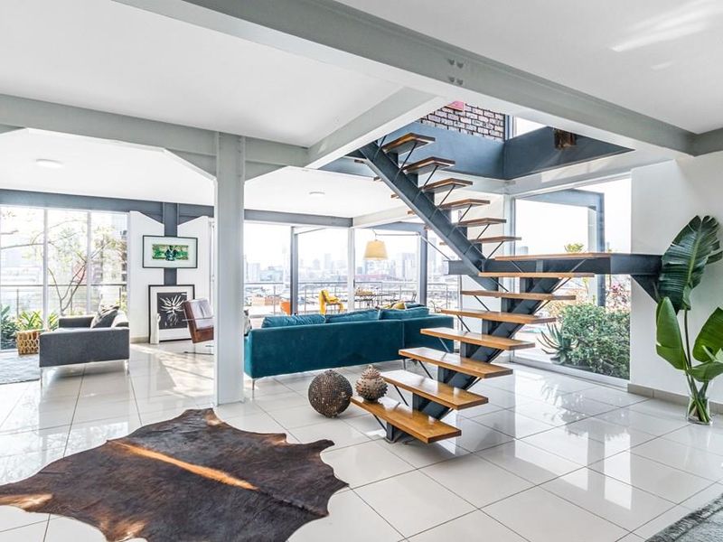 Urban loft living near Wits and 44 Stanley, offering refined entertaining with an open-plan layout, floating staircase and terrace with panoramic sunset views — two bedrooms, two bathrooms, two basement bays.