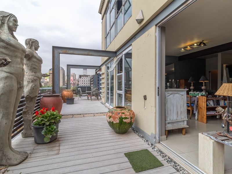 Entertainer's dream in vibrant Braamfontein — morning coffee and rooftop-style sunsets over Johannesburg from a large private patio with 180° skyline views; two ensuite bedrooms, open-plan kitchen, three underground parking bays.