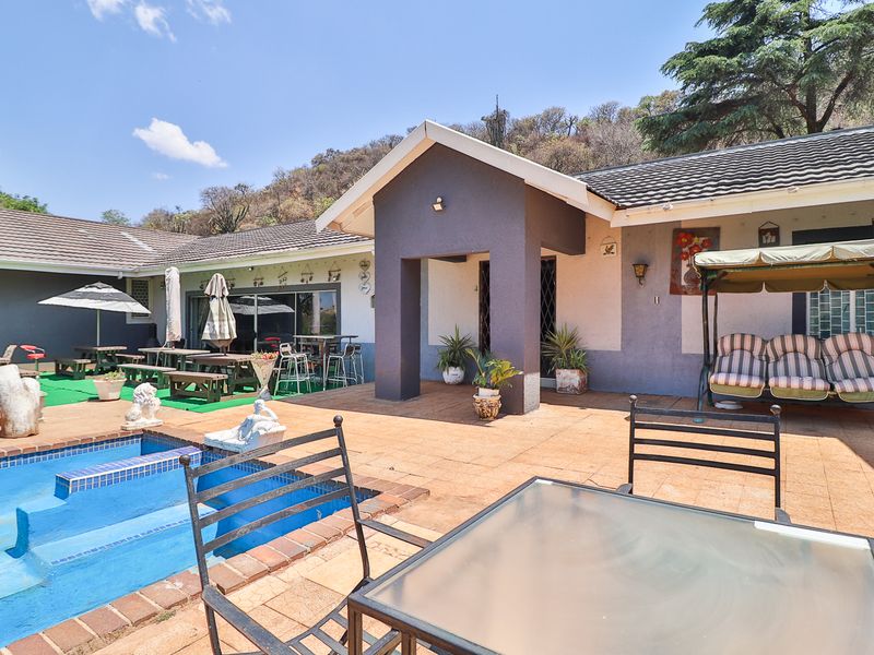 Entertainer’s mountainside retreat opposite Calvary Christian College off the R82, minutes from Southgate and Mall of the South, on 17,000sqm with deck, braai and splash pool.