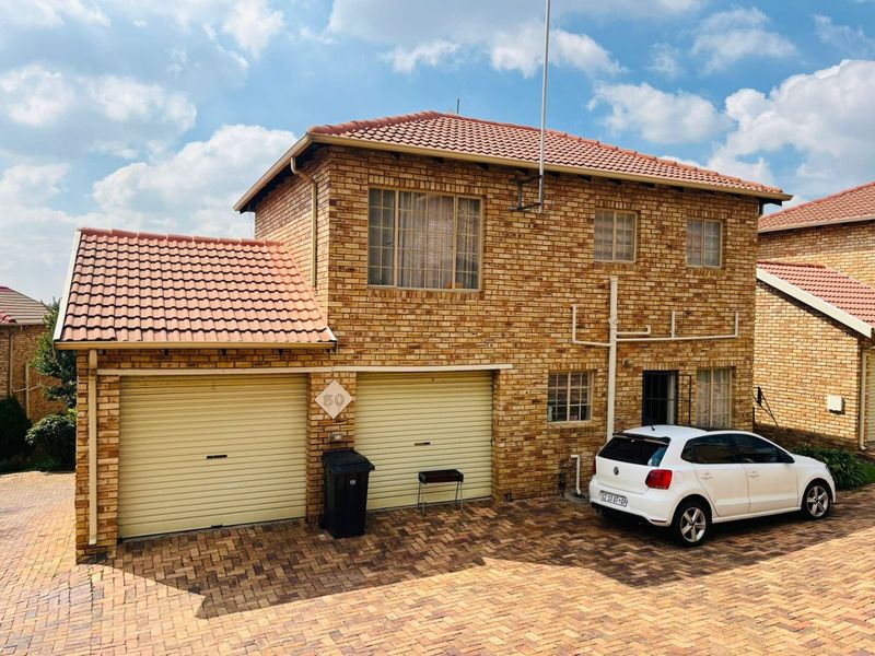 Peaceful family living in sought-after Elandspark, Johannesburg — secure gated community with 24-hour guards, open-plan lounge flowing to outdoors, modern kitchen; three bedrooms, two bathrooms, double garage.