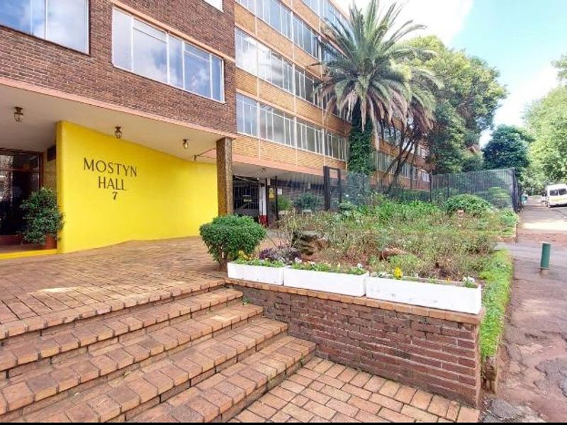 Relaxed Parktown living on a quiet tree-lined street, garden-facing bachelor with parquet floors and raised bedroom platform overlooking the pool — includes one bathroom and parking bay.