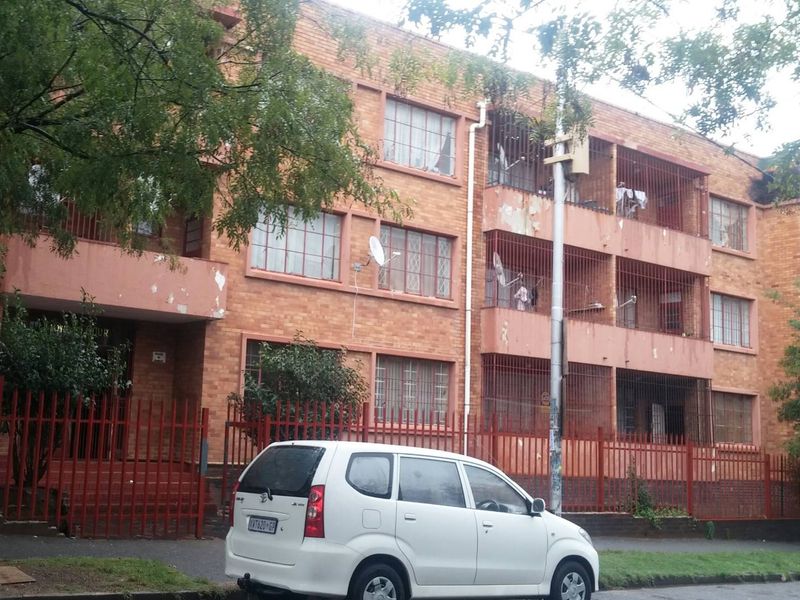 City-edge living near schools and South Rand Hospital, with a sunlit balcony overlooking Johannesburg, comfortable two-bedroom layout, one bathroom and covered parking.