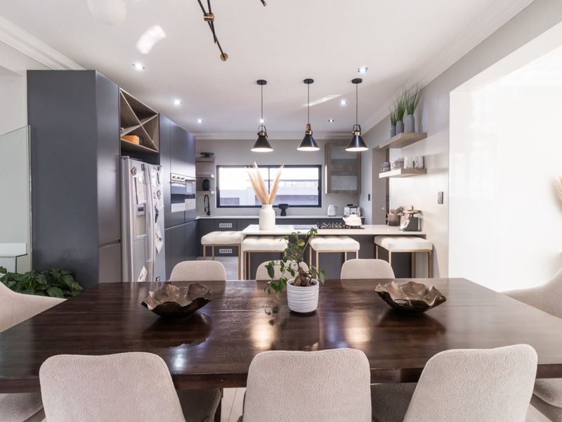 Entertainer's dream in Swallow Hills estate — secure 24-hour living with Gautrain and OR Tambo access; open-plan hub flows to pool through stackable doors. Four en-suite bedrooms.