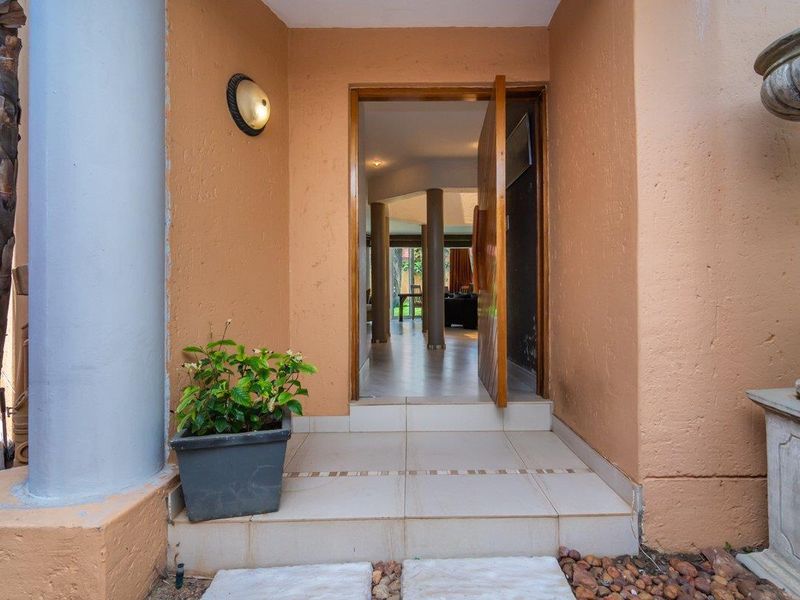 Entertainer's retreat in a peaceful, leafy setting with boma and braai, lush garden and big trees, modern white kitchen with scullery, three en-suite bedrooms, covered parking.