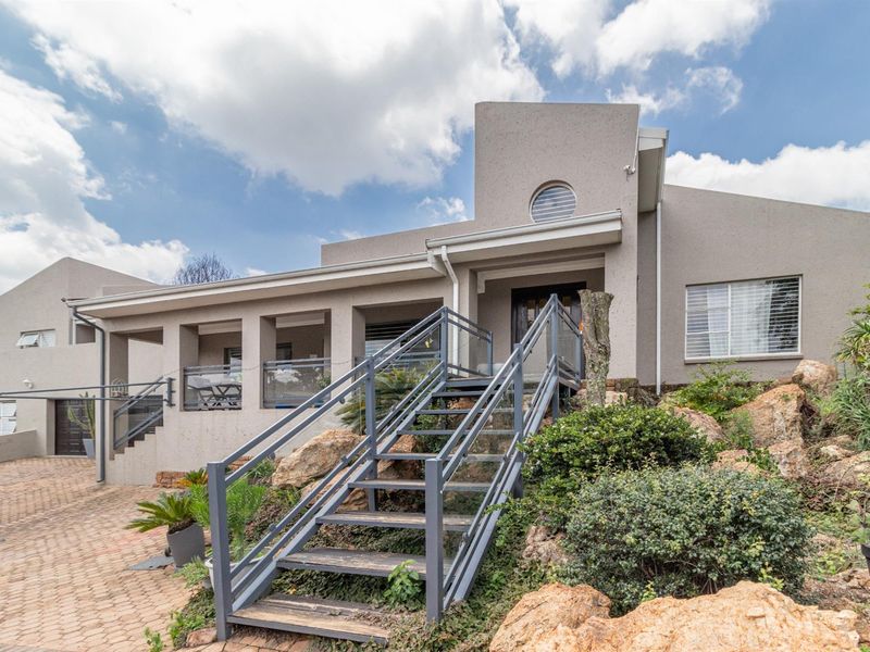 Entertainer's family haven in Noordheuwel, Krugersdorp with panoramic hilltop views, solar panels and backup water tank — generous parking and four bedrooms, four bathrooms, single garage.