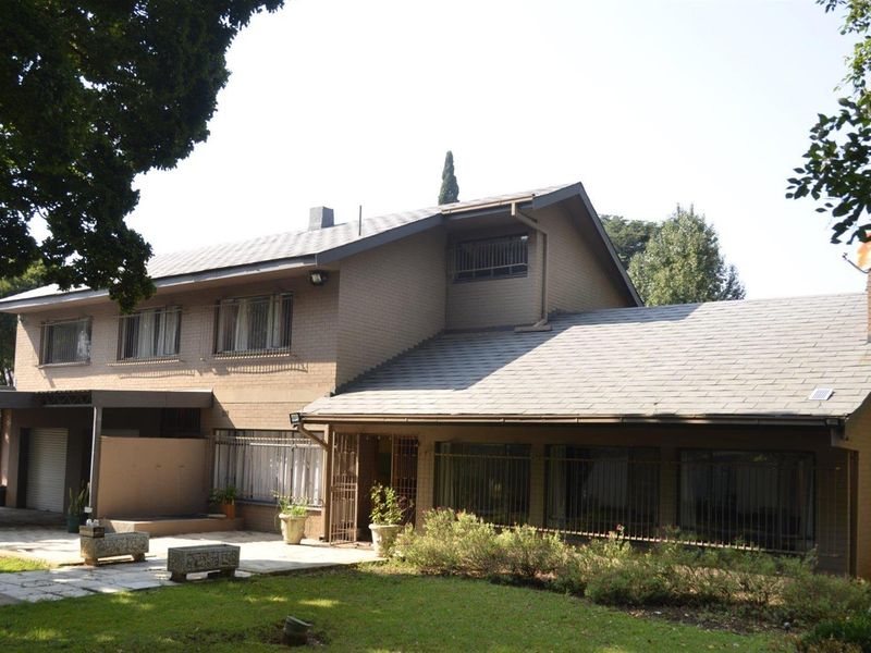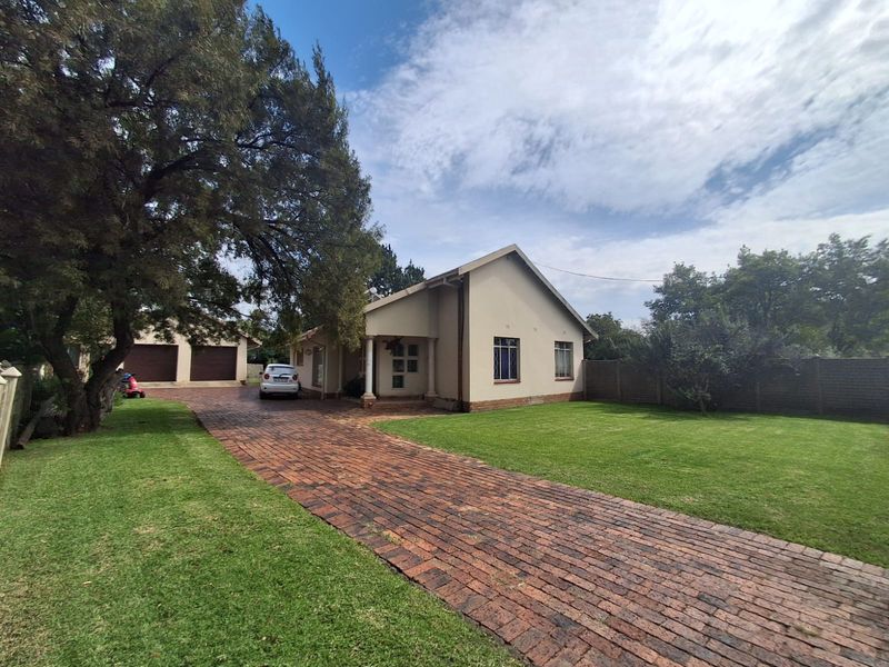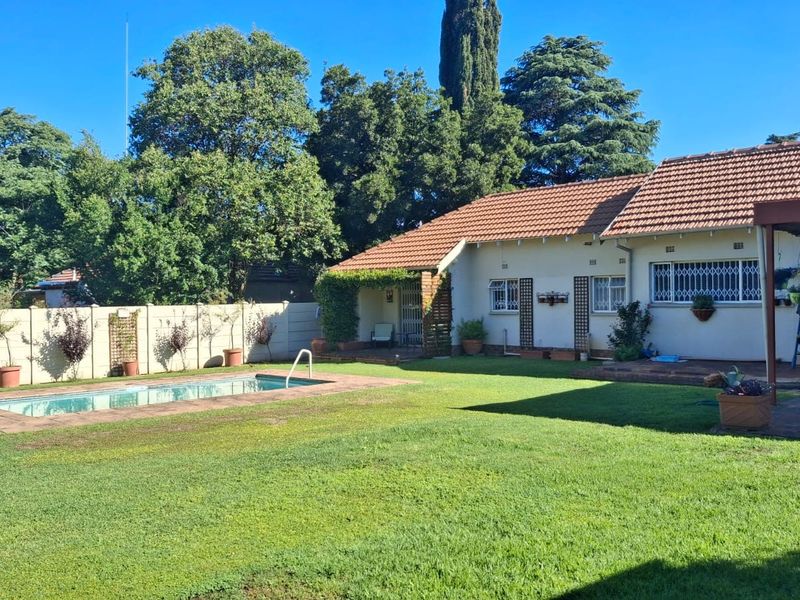 Urban living and income potential in central Meyerton on a double corner main road; features established fruit-tree garden and pool, five bedrooms, three baths, four covered parking.