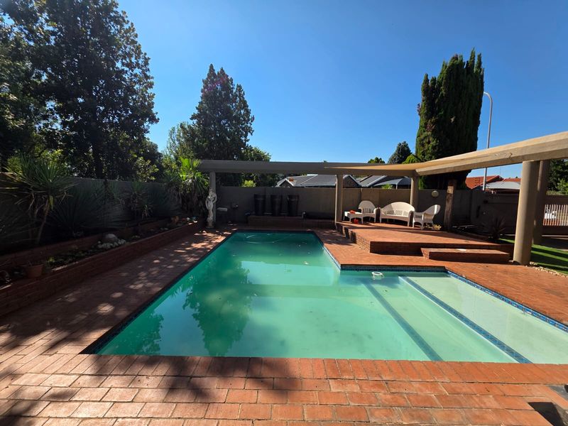 Poolside family living in a peaceful, tree-lined suburb — expansive garden with sprinkler and fish pond, dedicated entertainment area with outdoor braai; four bedrooms, two baths, double garage.
