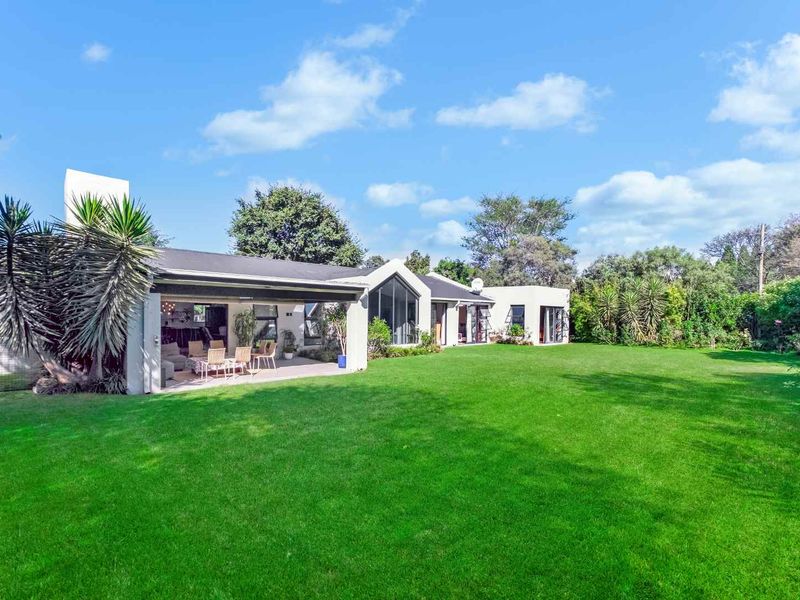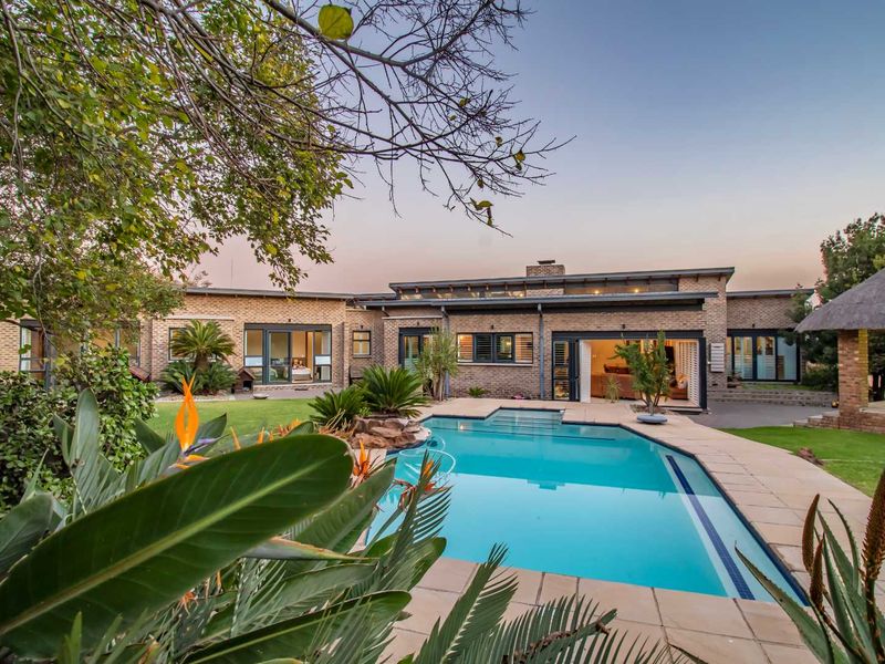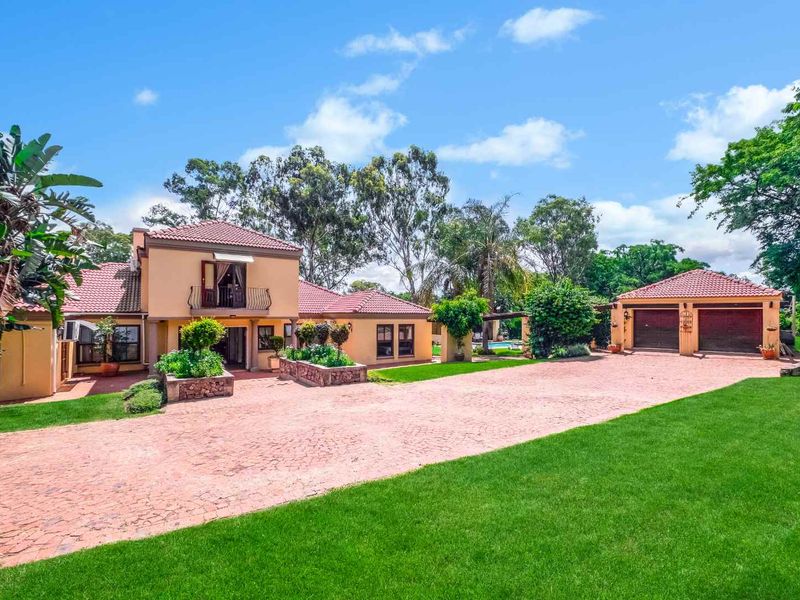 Country-living entertainer's retreat in Midrand countryside, framed by mature trees and a fruit orchard. Alfresco patio with pizza oven, pool; six bedrooms plus separate two-bed cottage and five garages.