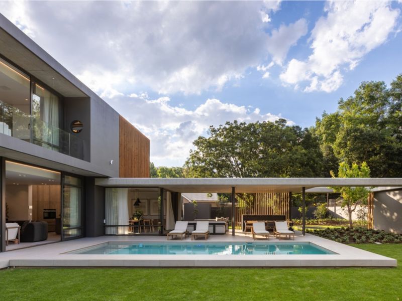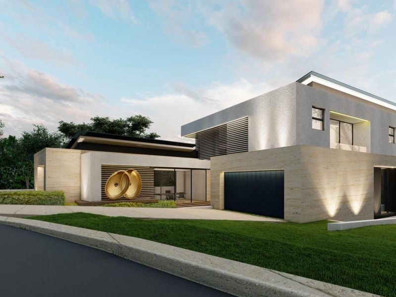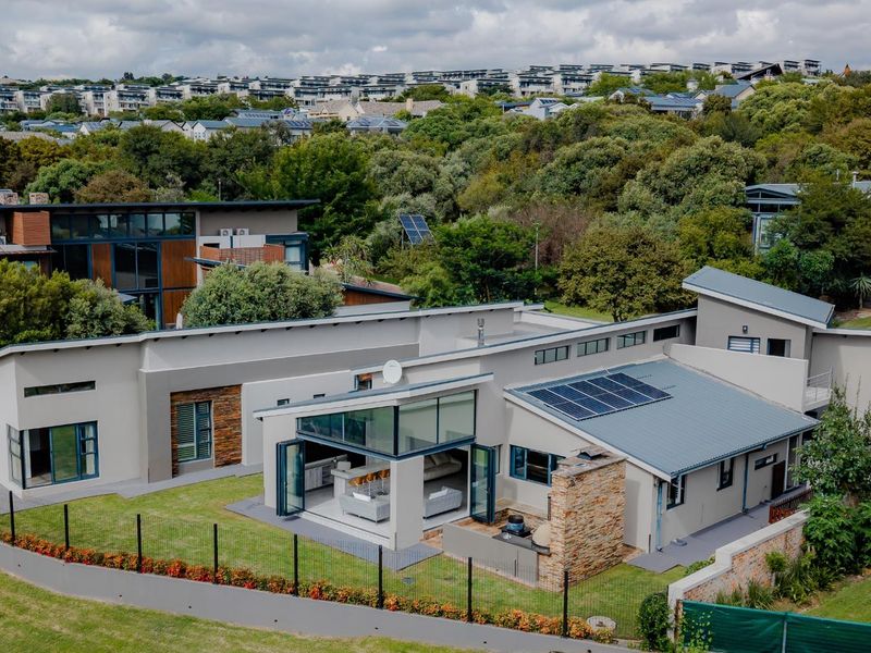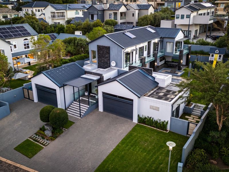 Modern sanctuary in Helderfontein Estate, adjacent to Steyn City — designer kitchen, covered patio, pool and 20kVA lithium solar backup for genuine off-grid living. 4 beds, double garage.