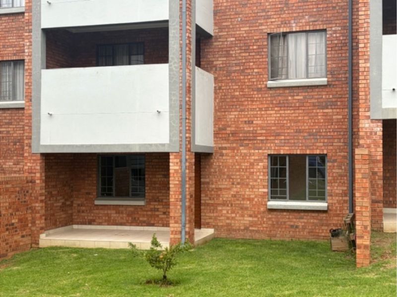 Easy lock-up-and-go living in Midrand's central business hub, steps from the Gautrain bus stop. Ground-floor unit with modern open-plan kitchen, patio and communal pool — two bedrooms, one bathroom.