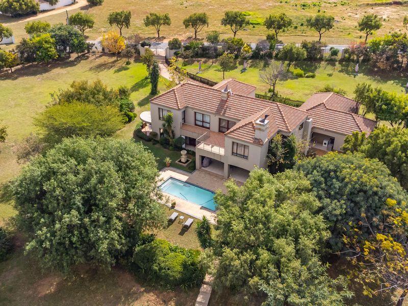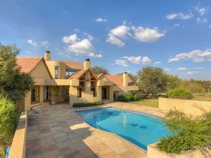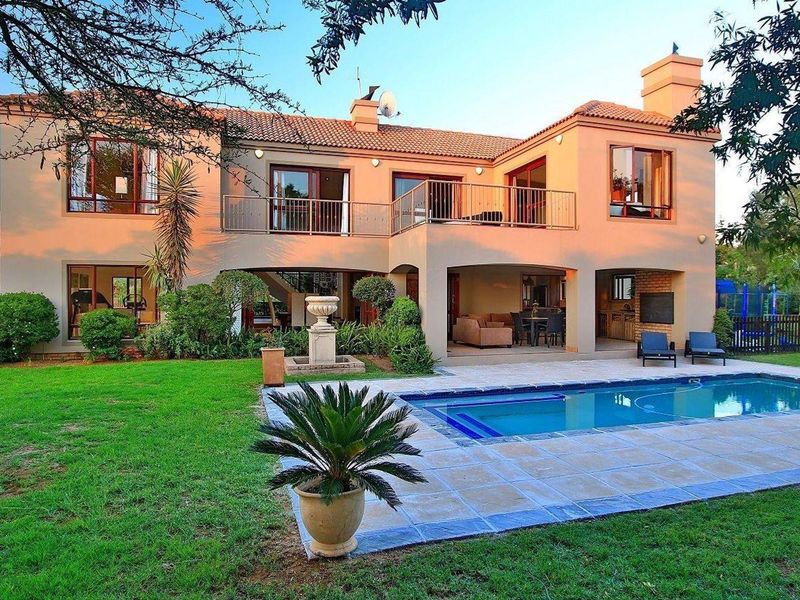 Effortless entertaining with panoramic Sandton skyline and Magaliesburg views in Saddlebrook cul-de-sac, featuring an enclosed entertainment area overlooking the pool, guest cottage, seven bedrooms and 4.5 baths.